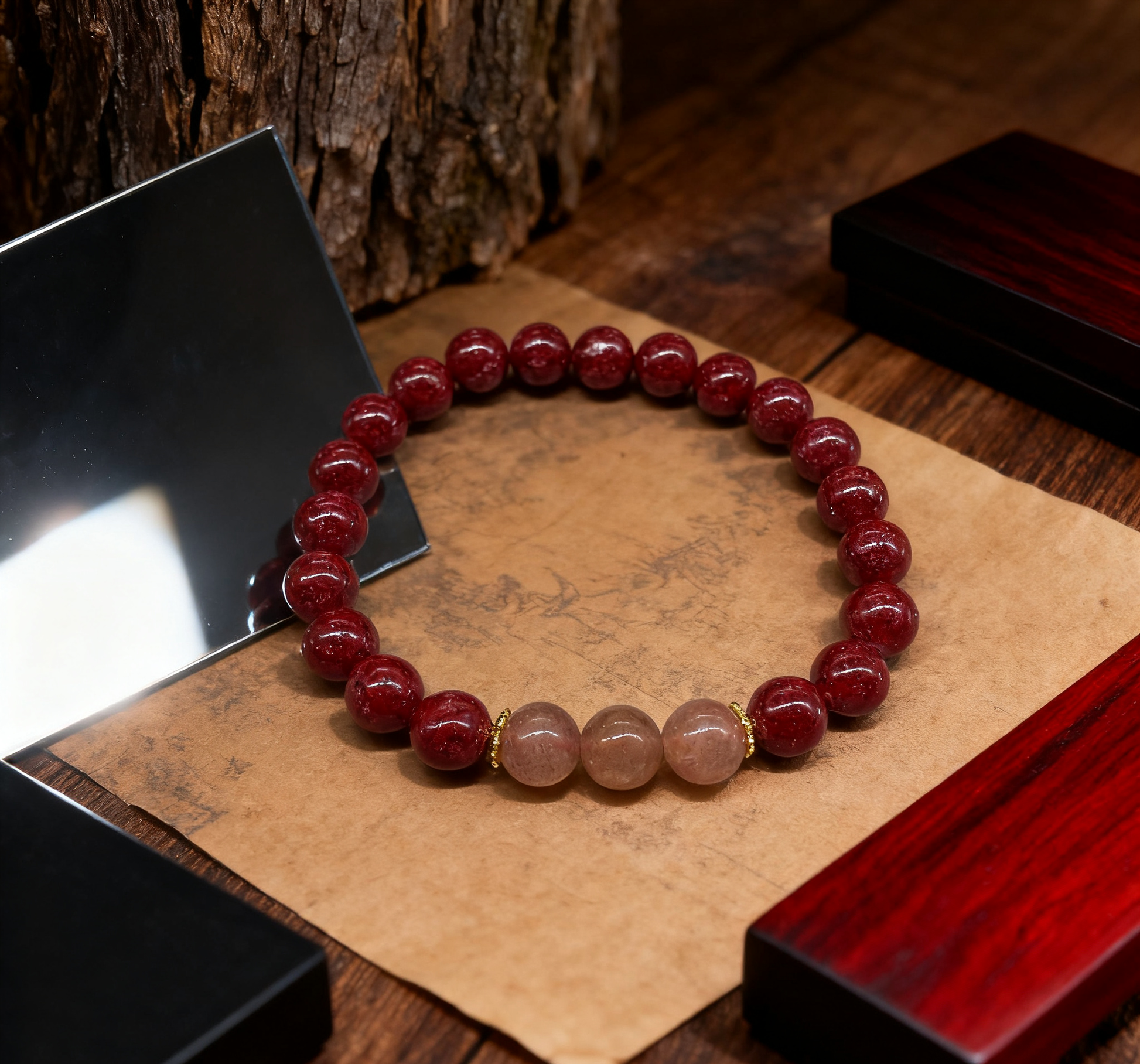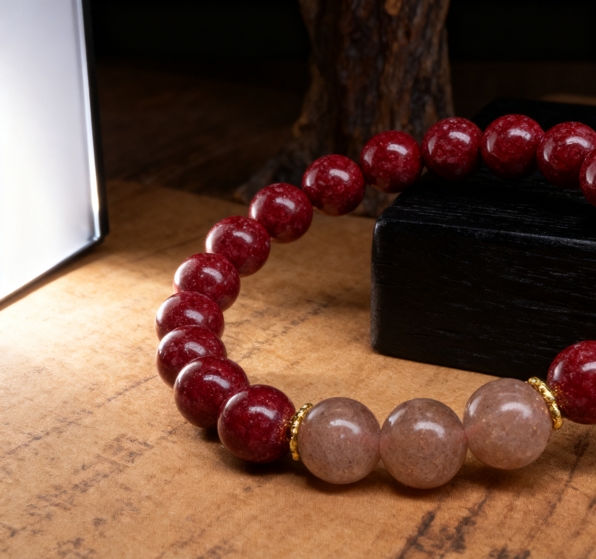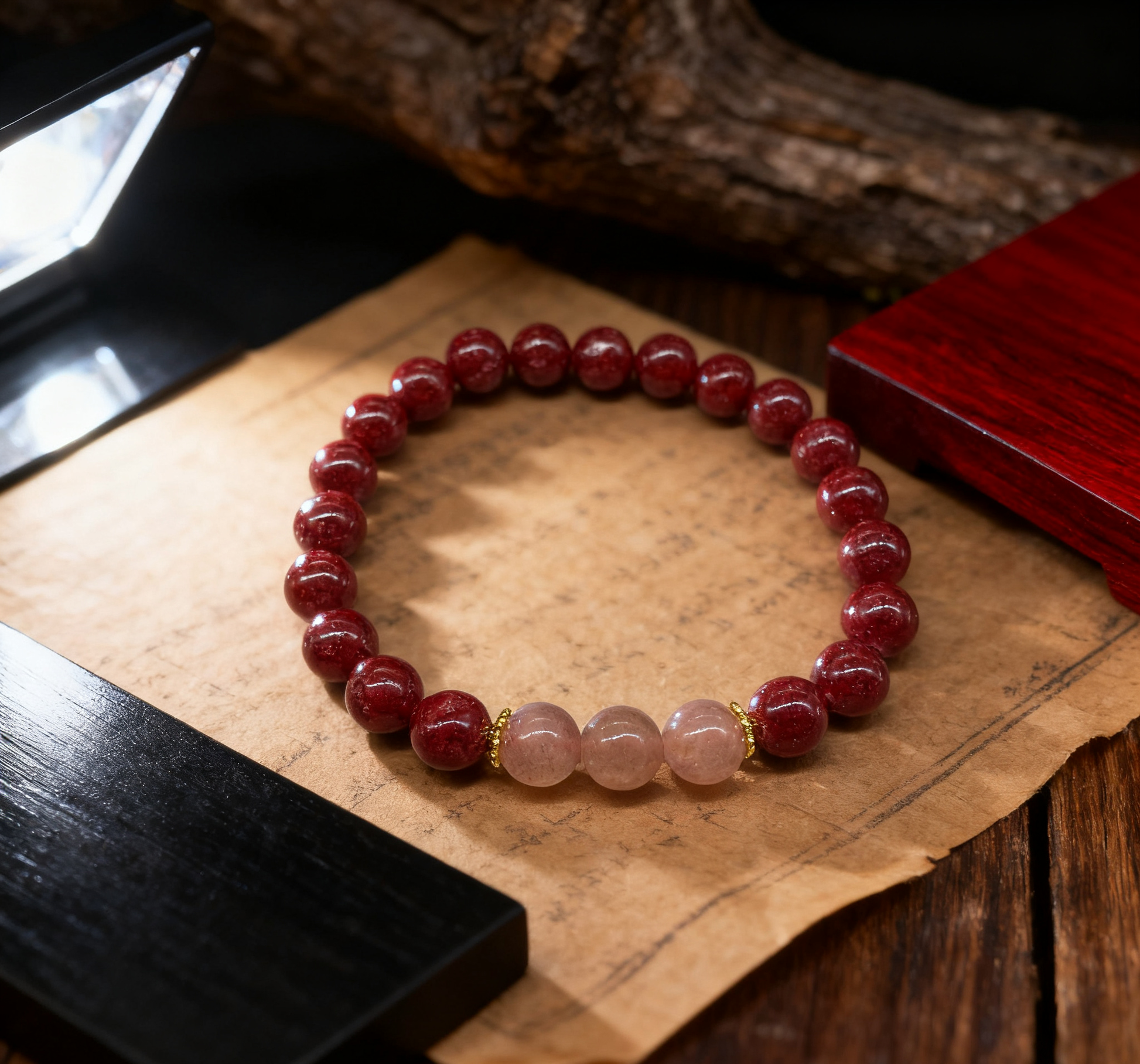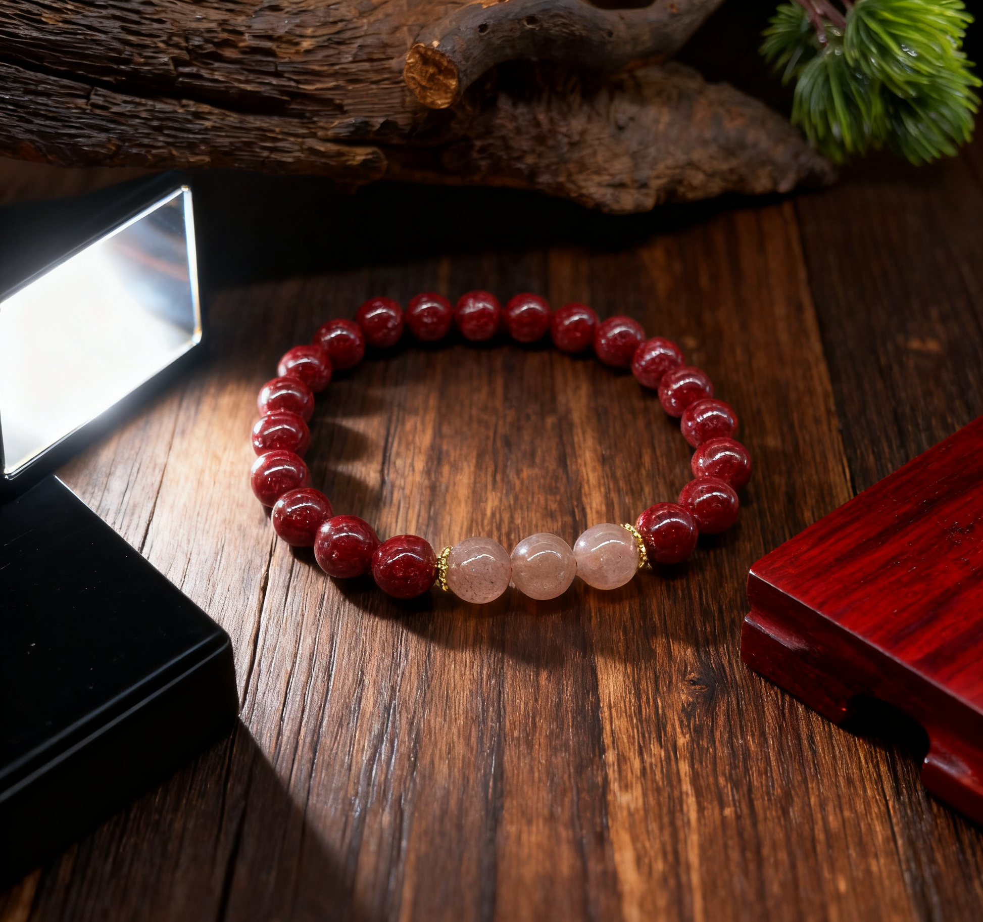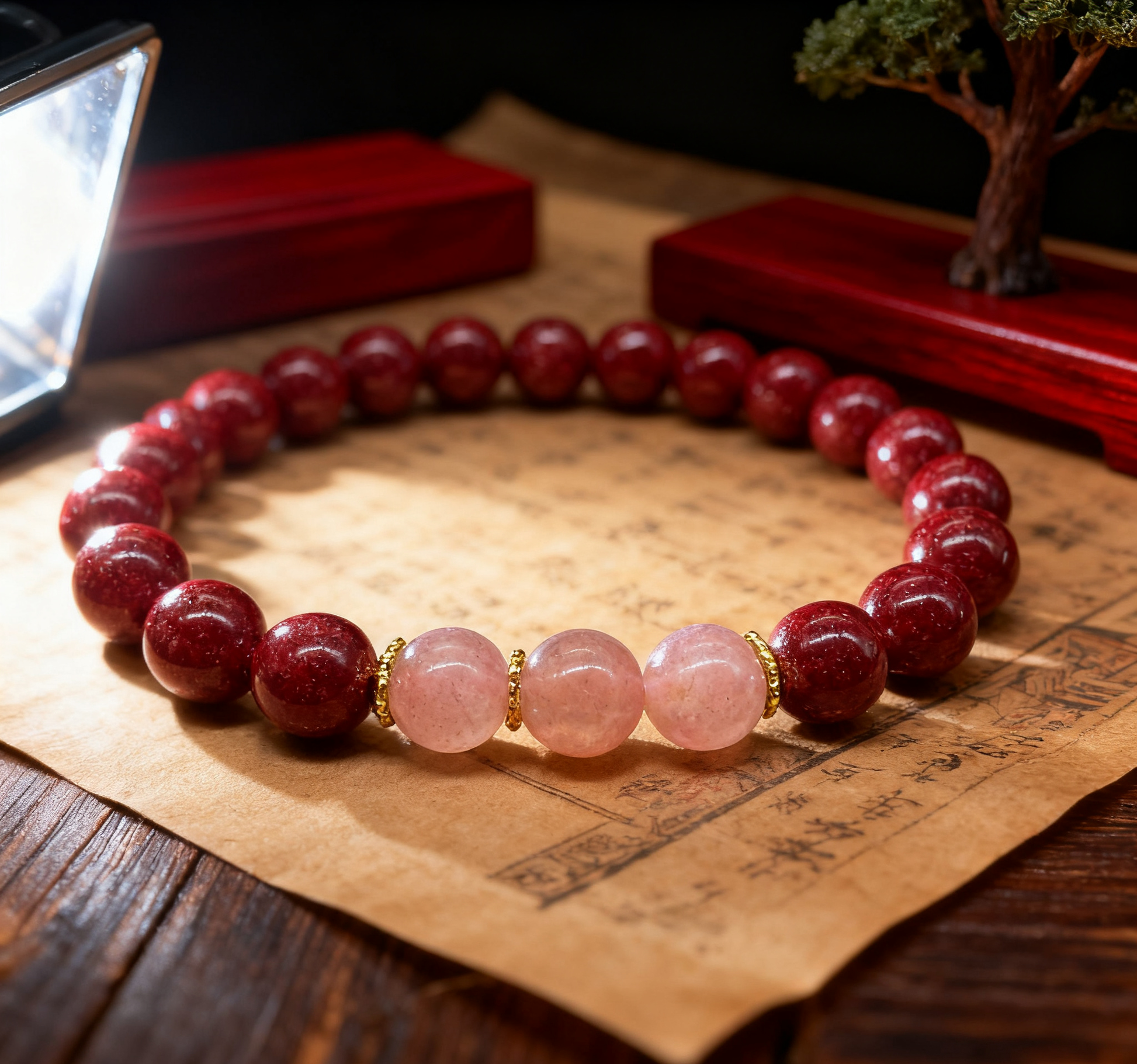 「乡野丫头」爱神加持 粉金桃花链 | 全透8MM草莓晶朱砂手串